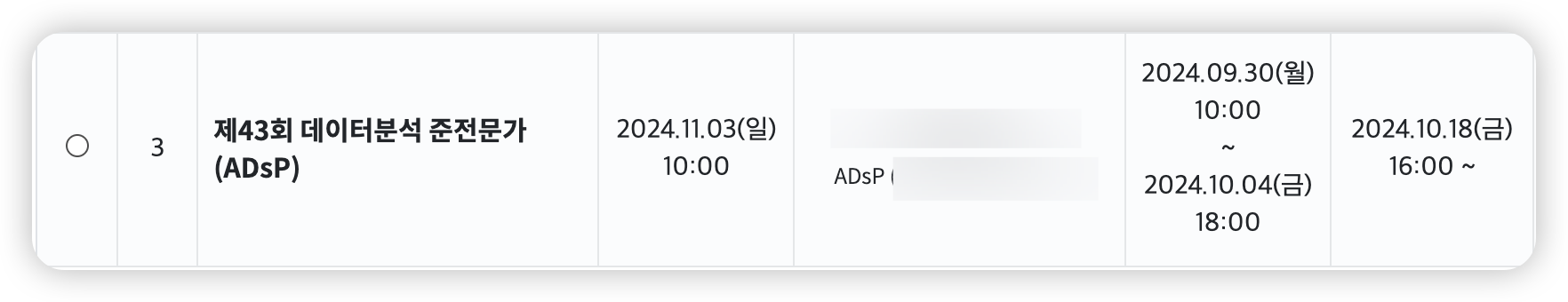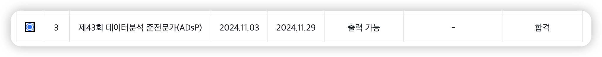 2024๋ 11์์ ์ทจ๋ํ ์ 43ํ ๋ฐ์ดํฐ๋ถ์ ์ค์ ๋ฌธ๊ฐ(ADsP)